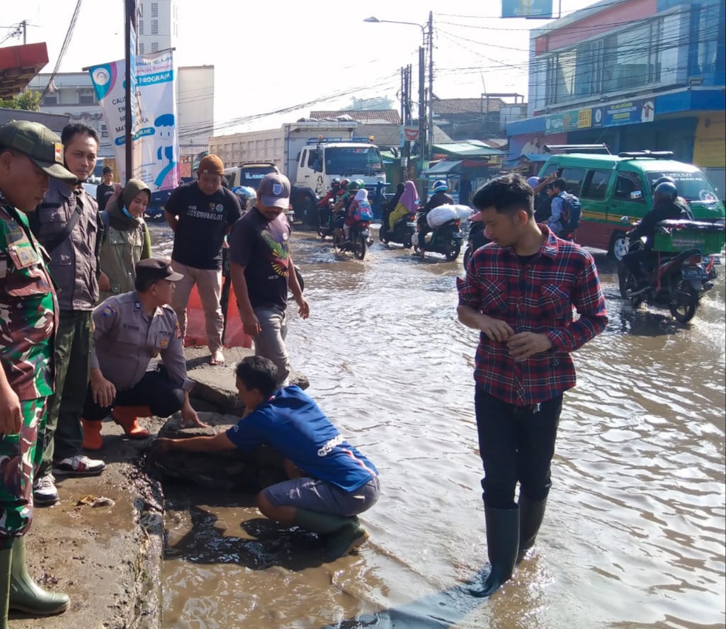 Genangan air tersebut terjadi karena tidak berfungsinya Drainase sehingga setiap hujan turun terjadi genangan dan mengganggu arus lalulintas, genangan air tersebut di sedot menggunakan mesin dan di alirkan ke sungai citarum.