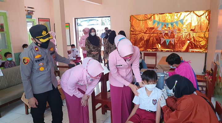 Kesempatan pagi ini Kapolres Cirebon Kota Akbp M. Fahri Siregar, SH.S.IK.MH dan Ketua Bhayangkari Cabang Cirebon Kota Ny. Ketty Fahri Siregar. Didampingi Wakapolres Cirebon Kota Kompol Ahmat Troy Aprio, S.IK dan Wakil Ketua Bhayangkari Cabang Cirebon Kota Ny. Anggi Troy., para PJU dan pengurus Bhayangkari Cabang Cirebon Kota. Meninjau pelaksanaan Vaksinasi anak Usia 6 – 11 Tahun bertempat di SD Kemala Bhayangkari 3 jalan Slamet Riyadi No. 20 Cirebon.