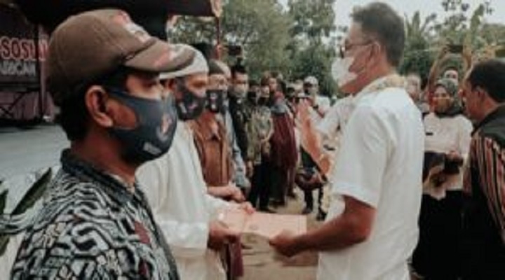 Sergapreborn Ciamis Bupati Ciamis, Herdiat Sunarya menyerahkan bantuan stimulan bagi para korban bencana gempa bumi tahun 2017 di Pamarican bertempat di halaman Desa Bantarsari Kecamatan Pamarican, Rabu (15/12/2021).