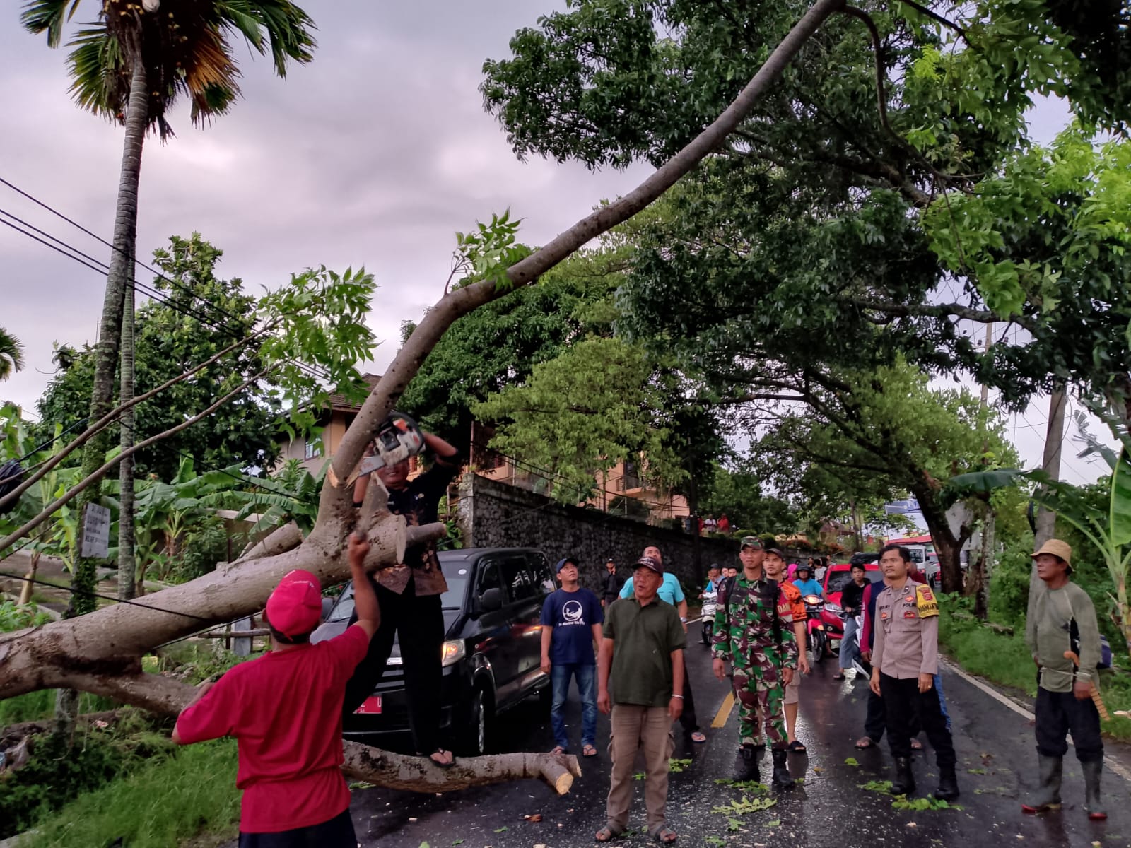 Sergapreborn Sukabumi-Forkopimcam Cisolok gerak cepat menangani pohon tumbang yang melintang di jalan akibat cuaca extrim angin kencang dan hujan, sekira pukul 17.15 Wib.(Jumat 13/12/2024).