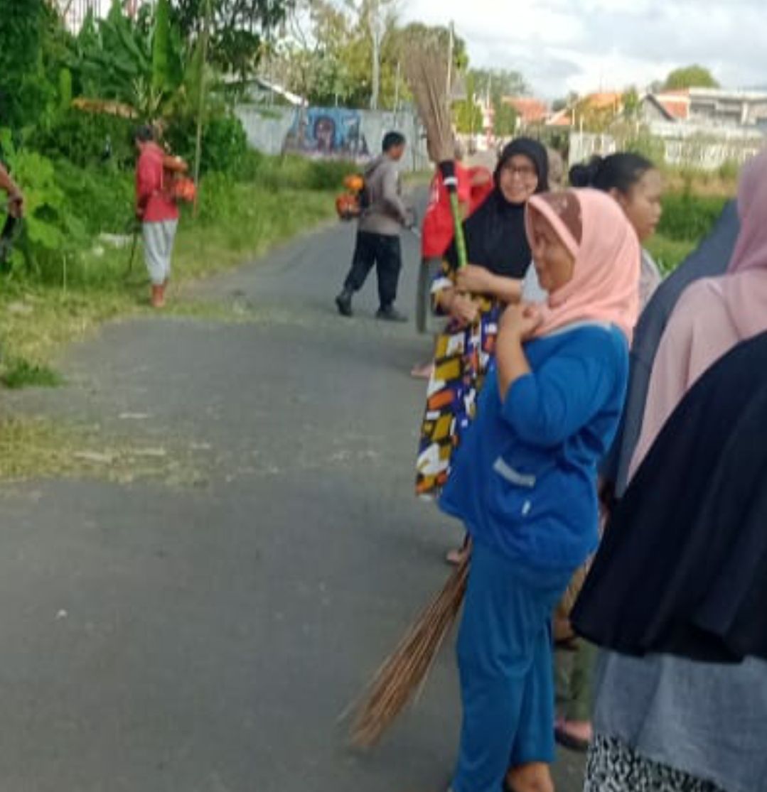 Bripka UU Handi terlihat bergabung dengan warga sekitar untuk membersihkan rumput dengan alat pemotong rumput.