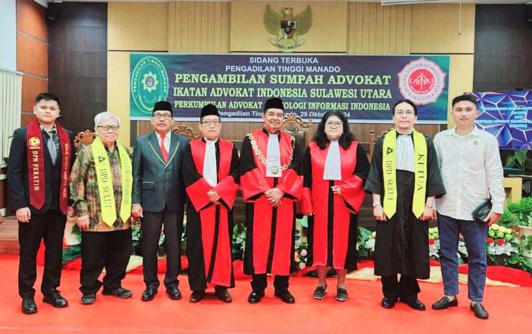 Kini giliran Sulawesi Utara, Advokat PERATIN, Kenneth Yasuhiro Keynes Panelewen, Am.S., SH., yang didampingi oleh Ridwan Pasorong, S.H. sebagai Wakil Ketua Komite Pendidikan Khusus Profesi Advokat (PKPA) & Ujian Profesi Advokat (UPA) turut hadir sebagai perwakilan dari Dewan Pimpinan Nasional (DPN) PERATIN untuk mengikuti Sidang Terbuka Pengambilan Sumpah atau Janji Advokat di Ruang Sidang Utama Prof. Dr. H. M. Hatta Ali, SH., MH. Pengadilan Tinggi Manado, pada Selasa (29/10/2024) bersama 4 orang dari OA IKADIN.
